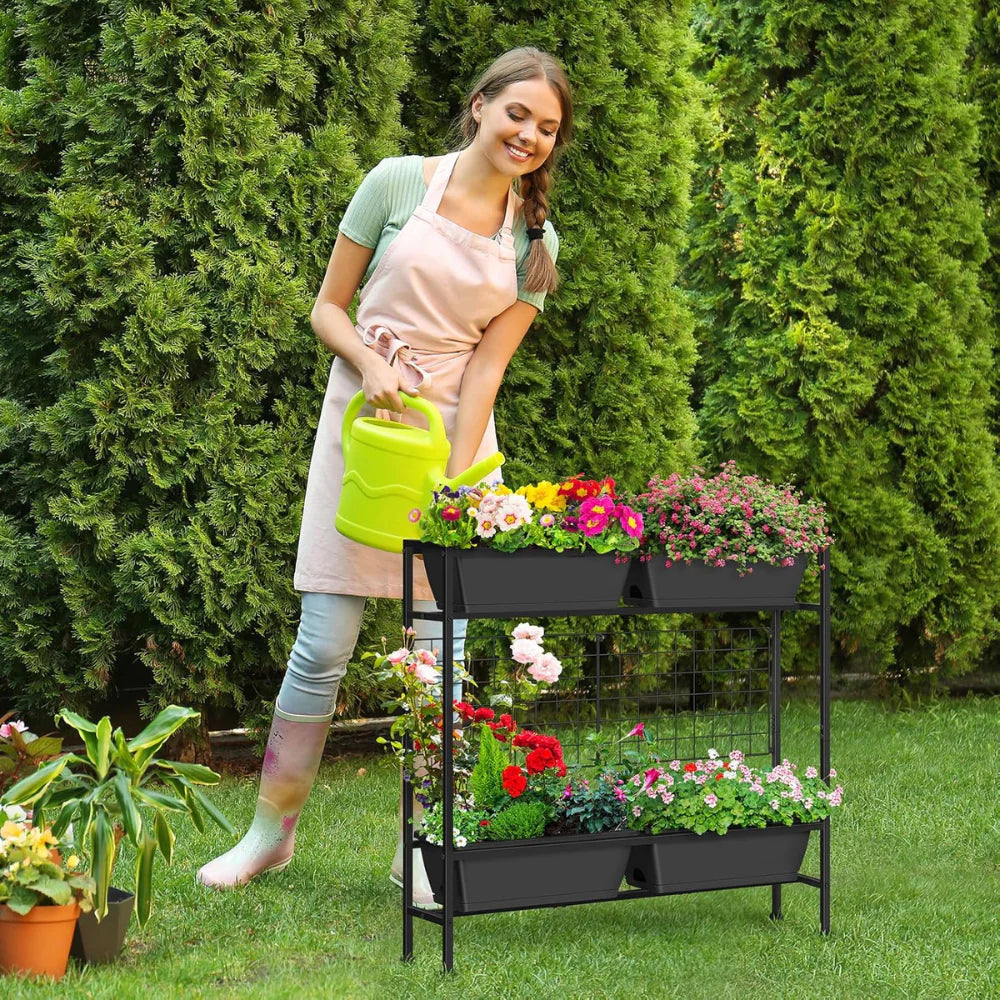 Constructed from durable plastic, it features a deep planting bed with a built-in drain plug to prevent overwatering, promoting healthy root development. The tall trellis provides vertical support for plant growth, making it ideal for vine species and decorative blooms.